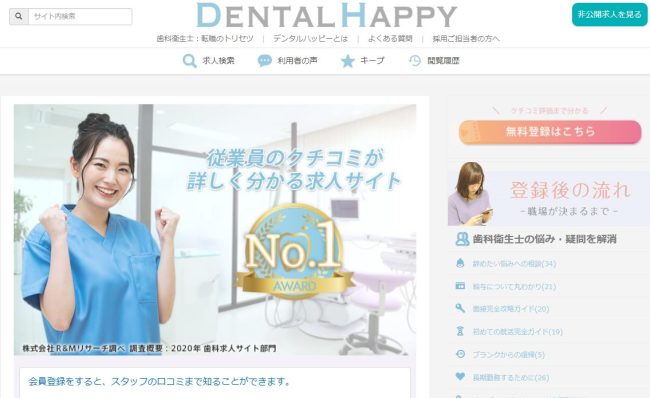 デンタルハッピーは、歯科衛生士向けの仕事探しをサポートする会社であり、スタッフ定着率が良いクリニックを中心に取り扱っている求人サイトとなっています。