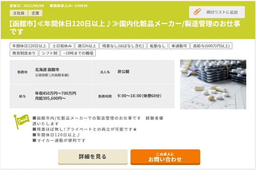 ただし2021年8月20日時点では、薬剤師の求人はないようです。薬剤師として資生堂で働きたい場合は、キャリアアドバイザーに相談してみましょう。