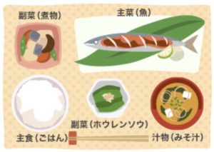 1汁3菜の特徴は、穀物の米を主食に、魚や大豆などのたんぱく源のおかずとなる主菜・煮物など野菜料理の副菜が添えられていることです。